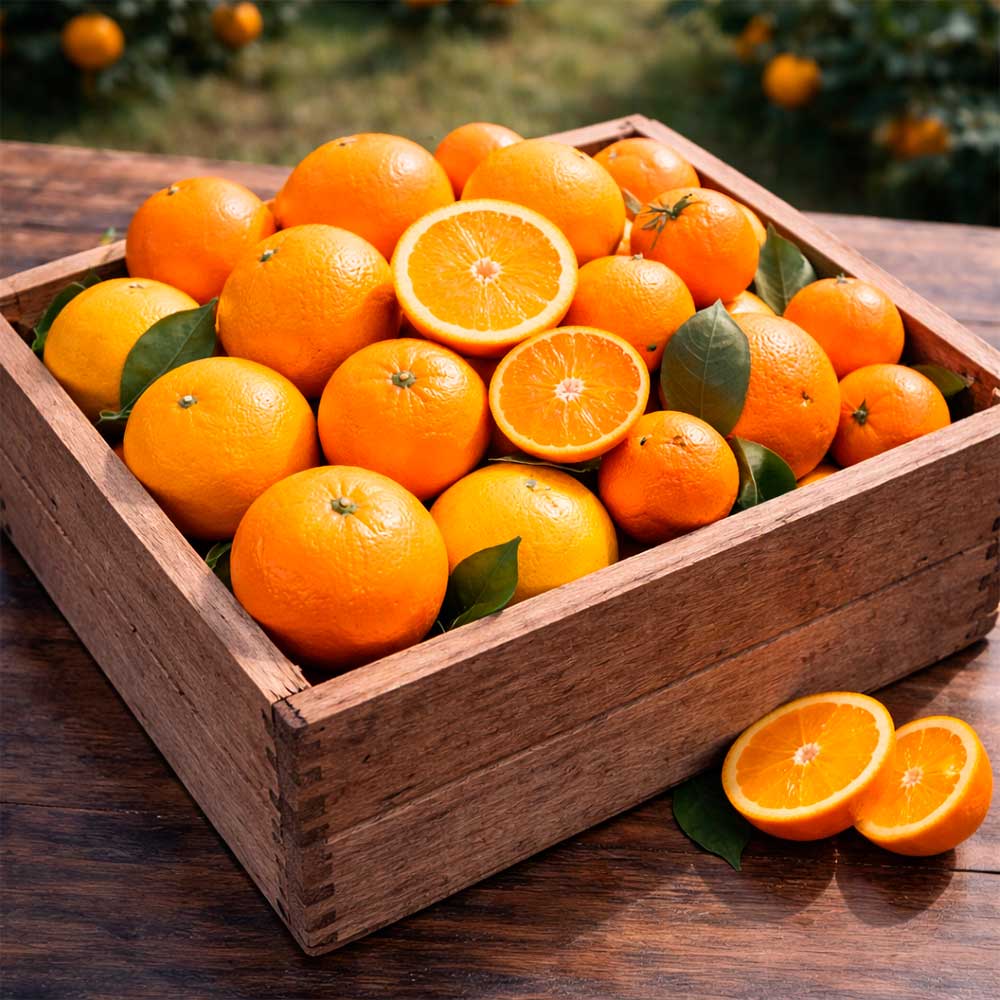 Nuestra naranja valenciana ecológica, se caracteriza por un intenso color anaranjado, corteza lisa y sabor intenso. Durante la campaña servimos diferentes variedades según la fecha de recogida, como navelina, navel foyos, salustiana, navelate, lanelate, valencia midnight, valencia delta y valencia late.